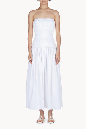 The Lauryn dress is a beautifully, feminine strapless sundress crafted from crisp cotton. Featuring our signature gathered detailing that runs throughout the spring summer collection, the Lauryn Dress is perfect worn for a summer occasion or warm days by the beach. The Lauryn Dress has a gathered skirt that falls gently to the hem at the perfect length finishing just above the ankle.